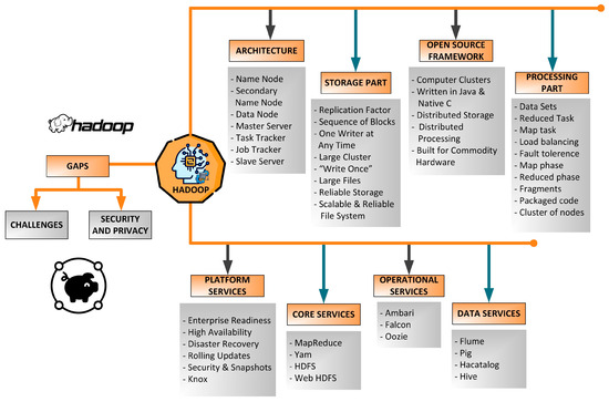 The multiple node-based clustered network is also operational at its full scale with the “Yahoo Developers Network”. A Hadoop cluster is functional in Yahoo with 4500 nodes, 40,000 servers, and more than 1,000,000 CPUs [17,24]. This also involves: (1) ad systems, (2) a web search, and (3) scaling tests. Here, the scaling test is particularly endorsed to large-scale testing for Apache Hadoop. Figure 4 shows a comprehensive infrastructure of the Hadoop Ecosystem. It elaborates the sub features of (1) the open-source network, (2) operational services, (3) core services, (4) architecture, (5) processing part, (6) data services, (7) platform services, (8) storage part, (9) gaps, (10) challenges, and (11) security and privacy aspects.