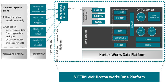 The designed attacks were simulated on operating systems driven on VM platform [46,47,48,49,50] as follows: (1) occurrence of two attacker VMs using Windows-based operating system (Windows Server 2008 [51], Windows 7 [52]) (a windows-based operating system), (2) two attacker VMs were driven by Linux operating systems (RHEL7 [53], CentOS [54]), (3) the VM for the infected/victim was based on Hypervisor (Type 1, VMware ESXi 5.5 [49,50], 64-bit) and Guest OS. Note, all VMs were built on the HDP VM platform [46,47,48].