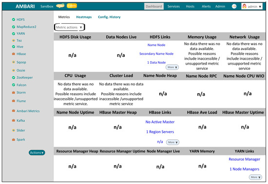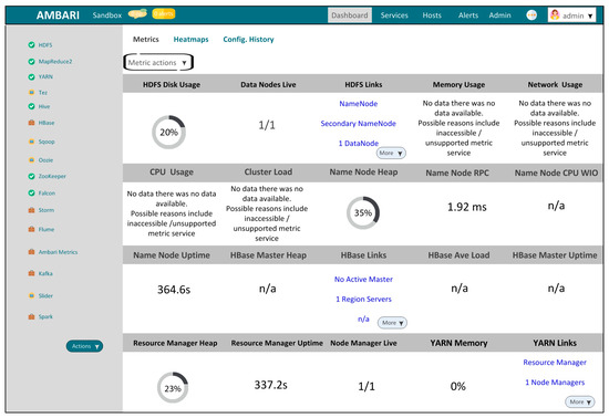 A decent choice for the attack classification method was made using cloud computing architecture and its implementation in test cases [33,34,35]. The classification method aims here to see the impact of cyber-attacks on (1) the CPU, (2) network, (3) memory, (4) data storage, and (5) physical disk usage. Five variants of cyber-attacks were considered on the Hadoop VM. A comprehensive explanation on attack methods’ details and real-time execution can be explored in the cloud computing book [34]. The aim here is to analyze the performance of the following parameters towards the cyber-attacks: (1) the CPU, (2) network, (3) database, (4) memory, and (5) physical disk usage. Five different types of cyber-attacks and activities on Hadoop VM ports were considered to make the users aware of infected VMs. It was also ensured that HDP is performing its normal and active operation. These attacks are (1) ordinary operations and activities of Hadoop, (2) an Ambari port-based XPOIC attack [55], (3) Ambari port-based LOIC attack [56], (4) Ambari port 8080-based RTDoS attack [57], and (5) Hadoop port 80-based LOIC attack. Figure 6 shows the Ambari-based web interface in the pre-attack mode.