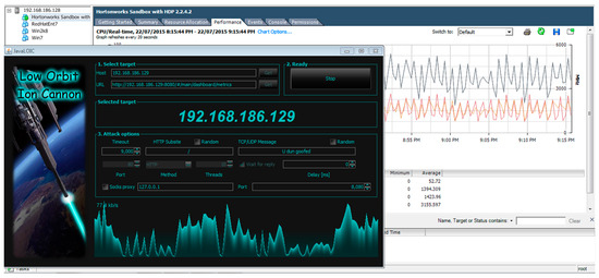 At the receiving end, HDP VM received IP 192.168.186.129 from the internal network DHCP server. This required an adaptive IP address which could generate the same ID throughout the process. Therefore, a Hartonworks Sandbox with HDP was provided with the same resources. Figure 8 shows the attack being performed on the VM with IP 192.168.186.129, port 8080, and generated attack with Java LOIC [58,59]. Note that during this attack simulation, only the VM of HDP was kept activated.