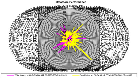 Figure 9 shows the data store-driven performance graph of Hortonworks sandbox VM. This performance graph reflects the occurrence of the Java LOIC attack. It can be observed that there are yellow spikes which define a sudden increase in the reading latency. Similarly, it can be observed that there are purple spikes which define a sudden increase in the writing latency. These latencies were observed during the 8:49:00 p.m.–9:02:00 p.m. time frame.