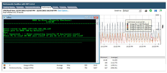 Figure 10 shows the Hadoop VM attack. This attack is made on default HTTP port 80. The attack was made using the RTDoS tool by Rixer [60,61,62]. Similarly, Figure 11 shows the graph of the CPU performance of the Hadoop VM. This performance was recorded during an attack using RTDoS by Rixer. It was observed that there is irregular CPU usage.