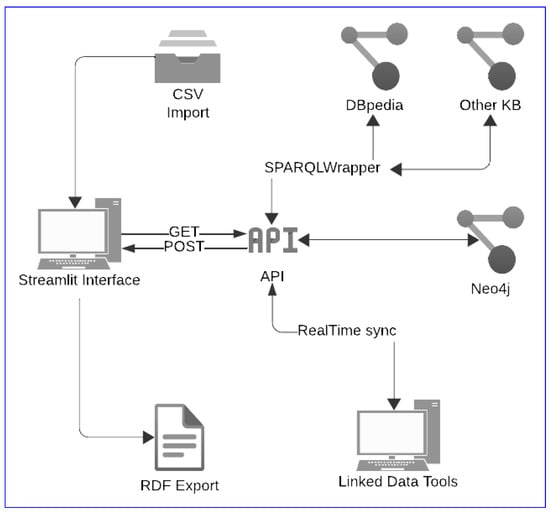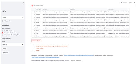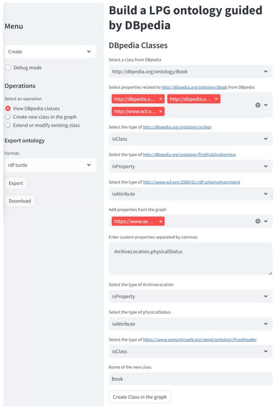 - Streamlit. (https://streamlit.io, accessed on 16 July 2024) functions as the primary interface, facilitating user interactions with the system. It allows users to perform operations such as selecting classes from DBpedia (https://dbpedia.org, accessed on 16 July 2024), creating new classes within Neo4j, and dynamically managing ontology properties. This front-end component enhances system accessibility for users with varying levels of technical proficiency, providing a clear and intuitive interface that simplifies the execution of complex tasks.