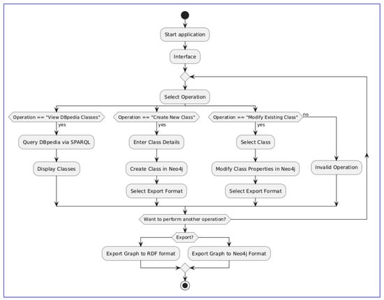 - SPARQLWrapper. (https://rdflib.github.io/sparqlwrapper, accessed on 16 July 2024) is employed for querying DBpedia, an organized version of Wikipedia that offers public access to its content in RDF format. This utility sends queries to DBpedia’s SPARQL endpoint to retrieve RDF class information. Users can utilize this data to define or augment their ontologies with real-world datasets, thereby increasing the semantic richness and applicability of the developed ontologies.