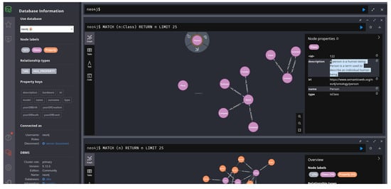 - Neo4j. (https://neo4j.com/, accessed on 16 July 2024) is the core graph database used to store and manage the ontological structures defined by users. Neo4j supports the Label Property Graph (LPG) model, which is particularly well-suited for representing the intricate relationships and attributes inherent in each node (class or entity). Neo4j’s selection was driven by its robust graph database capabilities, which align perfectly with the demands of semantic data modeling and linked data production. Its schema-less nature allows for the dynamic representation of complex relationships inherent in ontologies, making it an ideal intermediary between ontology design and linked data generation. Moreover, Neo4j’s support for the Cypher query language and its ability to efficiently manage and traverse large-scale graphs significantly enhance the performance and scalability of the system. This makes Neo4j not only a storage solution but also a powerful engine for executing graph-specific queries, ensuring data integrity and responsiveness in ontology management.