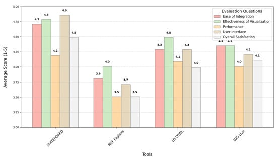 In summary, SKATEBOARD stands out as the most robust and user-friendly tool among those evaluated, with LD-VOWL and LOD-Live also performing well across most metrics. RDF Explorer, while useful, may require improvements in handling larger datasets to enhance user satisfaction. These findings provide valuable insights for users looking to integrate OntoBuilder with visualization and management tools for linked data.