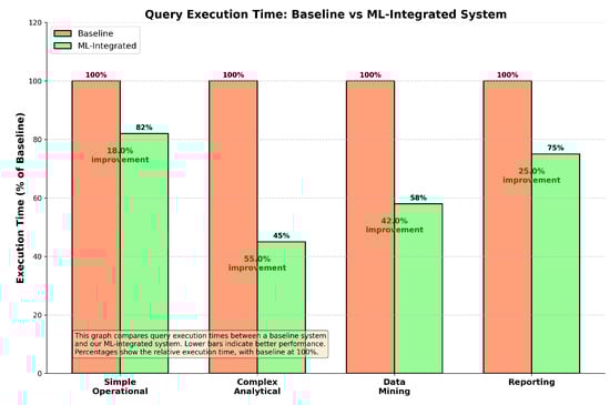 Query execution time: baseline vs. ML-integrated system. Lower bars indicate better performance, with percentages representing the relative execution time normalized to the baseline system (100%).