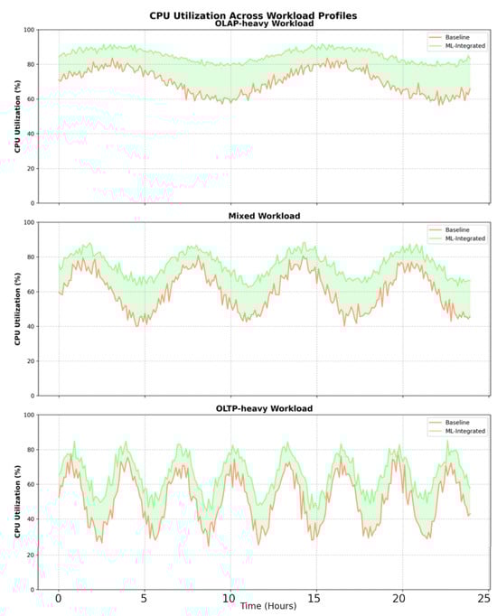 CPU utilization across different workload profiles. The shaded areas represent the difference in CPU usage between the baseline and ML-integrated systems.