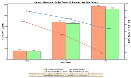 Memory usage and buffer cache hit ratio across data scales. Lower memory usage and higher buffer cache hit ratios indicate better performance.