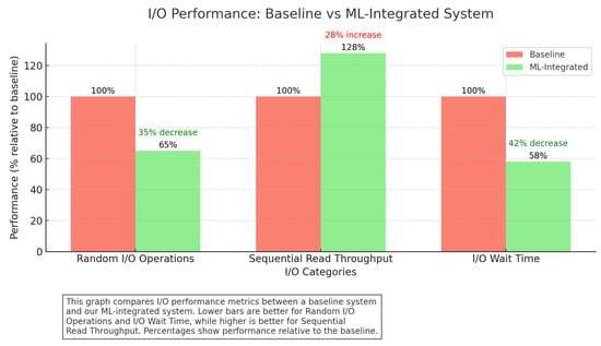 I/O performance: baseline vs. ML-integrated system. Lower bars for random I/O operations and I/O wait time and higher bars for sequential read throughput indicate better performance.