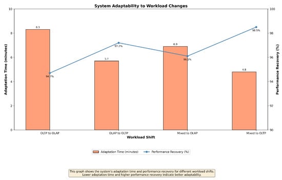 Figure 8 illustrates the system’s adaptability to sudden workload shifts, measuring the time taken to adapt and the percentage of performance recovery.