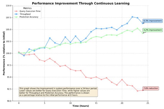 Figure 9 shows how the system’s performance improves over a 24-h period due to continuous learning, measured across three key metrics: query execution time, throughput, and prediction accuracy.