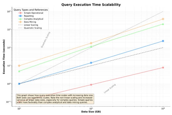 Scalability analysis: query execution time across different data scales. The graph uses logarithmic scales, with lower lines indicating better scalability.