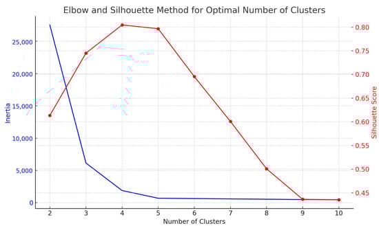 Figure 11 shows the elbow method (blue line) and silhouette score (red line) for determining the optimal number of clusters in our workload patterns. The elbow point at five clusters indicates the optimal trade-off between the number of clusters and within-cluster variance (inertia). Simultaneously, the silhouette score peaks at five clusters, confirming this as the optimal number of clusters for our dataset.