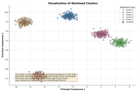 Visualization of workload clusters identified by the ML model. Each point represents a workload, and colors indicate cluster membership.