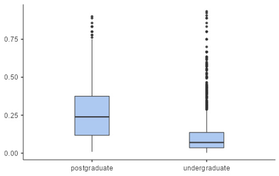 Postgraduate participation rates also showed variation between M.Sc. programs. The programs with the highest participation rates were Modern Wireless Communications of Information Technology and Telecommunications Department (M = 55.52%, SD = 15.90%), Computer Science and Technology, also of Information Technology and Telecommunications Department (M = 37.73%, SD = 11.45%), and Public Administration and Digital Transformation of Management Science and Technology Department (M = 32.00%, SD = 3.27%). The programs with the lowest participation rates were the Nursing department’s program on care for children with special needs (M = 8.36%, SD = 2.48%), Food Science and Technology’s MBA program (M = 9.74%, SD = 4.05%), and Sport Organization and Management program on disabilities (M = 17.59%, SD = 11.99%). Postgraduate participation rates ranged from under 10% to 75%, with most programs falling between 15 and 50%. On the other hand, undergraduate participation rates are mostly gathered in the range of 5.3 to 20%. As is obvious in the following boxplot diagrams (Figure 1), the high participation rates can be considered outliers since they fall above Q3 + 1.5*IQR, where Q3 is the upper limit of the third quartile and IQR is the difference between Q3 and Q1 (the upper limit of the first quartile).
