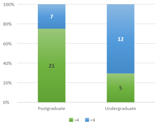 It is evident that students in postgraduate programs assess teaching more positively. By setting the rating of 4 as the threshold for “Satisfactory” teaching assessment, we can note that 12 undergraduate departments were rated lower than 4 and only 5 higher. On the contrary, out of the 28 postgraduate programs, 21 were rated higher than 4 and only 7 lower (Figure 4).
