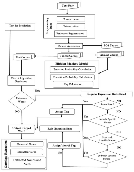 12], which integrated a bi-gram Hidden Markov Model (HMM), with a modified rule-based system tailored for Badini. Maximum likelihood estimation was used for parameter estimation, and the Viterbi algorithm was employed for HMM implementation. A module has been developed to refine tag assignments. In addition, the UOZBDN annotated corpus was created, comprising five categories, 51,761 manually annotated words, and 230 articles. The Kurdish Badini tagset, derived from the Stanford POS tagset, consists of 38 tags and was constructed here. Ontologies, abstract models representing concepts and their relationships, provide a structured approach to information retrieval [