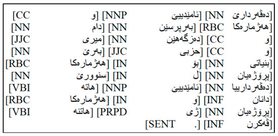 - Hassani, H. Part of Speech Tagging (POST) of a Low-Resource Language Using Another Language (Developing a POS-Tagged Lexicon for Kurdish (Sorani) using a Tagged Persian (Farsi) Corpus). arXiv 2022, arXiv:2201.12793. [Google Scholar]