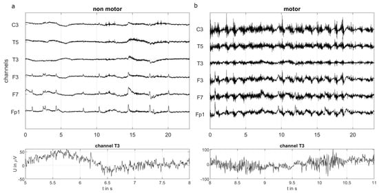Top: example frame (23 s) of non-motor seizure (a) as well as motor seizure (b) signal patterns of left side EEG channels recordings from the EPItect data set. Bottom: three-second part of the above-shown signal of channel F3 in the range of to V and to V for non-motor and motor seizures, respectively.