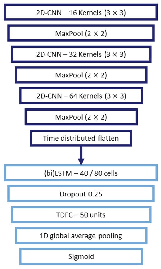The CNN part consists of three 2D layers followed by MaxPooling layers, as depicted in the upper part of Figure 3. The first 2D convolutional layer filters raw EEG data using 16 3 × 3-kernels resulting in an output with two reduced samples of D and C, but with 16 additive frame images due to the 16 kernels. A following MaxPooling layer with size 2 pools the frame images preserving the maximum value of each 2-by-2 matrix and reduces the dimension of D and C by a factor of two, thereby also reducing the computational cost. The second and third convolutional layers consist of 32 and 64 kernels, respectively, while the following MaxPooling layers again use a 2-by-2 matrix. The resulting patterns are flattened and distributed in time afterward to obtain the correct input dimension to the LSTM part. The LSTM part of the model is built as explained in Section 2.3, whereas in this case a bidirectional LSTM (biLSTM) with 40 cells was used as Golmohammadi et al. [] proposed.