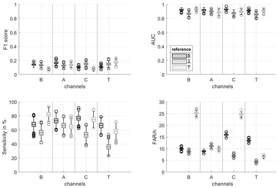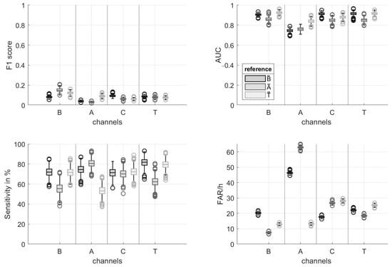 For the single-channel baseline model (sLSTM) introduced by Hussein et al. [], the results for different reference electrodes differ significantly. As presented in Figure 4, the model produces approximately 20 false alarms per hour when referencing the T4 channel signal to and . This false alarm rate could be reduced by referencing to ; however, this condition also lowers the sensitivity to a median of 56% and produces an AUC value of 0.84, which is significantly lower than for the other conditions. When using the opposite channel T3 as a reference, the highest F1 score for this model is achieved (which is still low at 0.09), with a median sensitivity of 70% and FAR/h of 17.