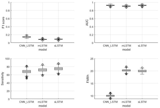 F1 scores, AUC values, sensitivity, and false alarms per hour (FAR/h) of the proposed RNN models when using EEG signals of channels B referenced to .