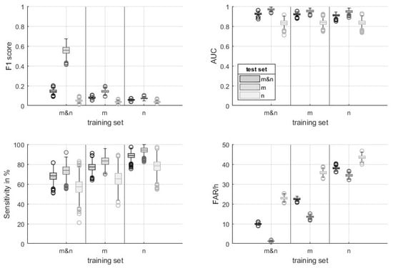 Since different EEG databases for ESD contain different percentages of motor and non-motor seizures for training, we explore the effect of these two classes on ESD performance. Specifically, we test classification when training and testing with each class alone (matched training), training with one class and testing with the other (mismatched training), and using all available data, combining both seizure types. Hence, the ESD model was trained and tested with motor and non-motor seizures separately as well as combined data. Figure 8 shows the F1 scores, AUC value, sensitivity in %, and FAR/h when using the best-performing model (CNN-LSTM) with behind-the-ear electrodes only (as explained above). When training the model with motor and non-motor seizures, the classification performance differs significantly from results obtained from models with class-specific training: For the combined model, 73.6% of motor seizures and 57.1% of non-motor seizures were detected. Motor and non-motor seizures produced FARs of 1.3 and 23 per hour, respectively. Significantly more motor seizures were detected when training class-specific models (83% for motor-seizure training; 94% for non-motor-seizure training). At the same time, the FAR/h value was increased to 13.5 (motor) and 34 (non-motor) for the class-specific models. More non-motor seizures were detected when training the model only with non-motor seizures (around 78%); the FAR/h, however, also increased drastically (up to 46). Overall, motor seizures appear to be detected more reliably than non-motor seizures, whether or not the model has been trained with motor or non-motor seizures separately. The model does not profit from training with motor or non-motor seizures separately, on the contrary, the overall classification performance decreased.