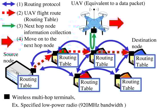 We have established a distributed management system for UAVs that was inspired by the virtual circuit and datagram methods of packet switching networks []. We investigate a method to construct safe and efficient navigation routes for UAVs over a multi-hop network with radio terminal nodes as shown in Figure 1. In this method, UAVs are treated as data packets in a network, ground wireless devices as routers, and the connection between wireless devices as links, and the control of a packet switching network is applied to UAV flight path control.