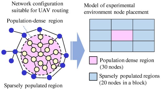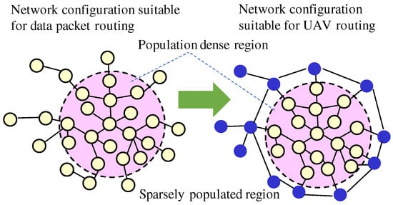 Any route for the UAV navigation must be safe and efficient. Thus, the route requires bypass nodes in population-dense regions as much as possible to ensure safety []. For this purpose, we consider two levels for the network configuration. The higher level composes the transmission network with nodes in sparsely populated regions. This level is used as the preferred route because it is safe. The lower level is the access network with nodes in population-dense regions that connect to the transmission network via the shortest route. The right side of Figure 2 shows an example of the network configuration suitable for UAV routing.