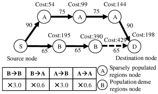 In order to search for the optimal route considering the distance and safety, the distance and region information obtained from the HELLO message must be advertised to the entire network. Therefore, the region information of the sending node and the distances between the nodes and the region information corresponding to the “Advertised Neighbor Main Address” are added to the TC message header. When a node receives a HELLO and TC message, it updates the routing table for each node using the Dijkstra method, using the link cost as the danger-weighted distance for each link. Figure 3 shows the method based on OLSR for constructing optimal route. The link where the UAV moves toward the population-dense region is weighted by multiplying the distance by 3.0 to increase the cost because it is dangerous. The link where the UAV moves toward the sparsely populated region is weighted by multiplying the distance by 0.6 to decrease the cost because it is safe.