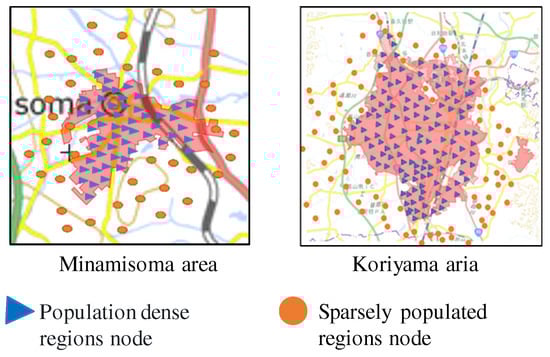 If all the wireless terminals in houses are used as relay nodes, there will be a lot of routing protocol signals. Referring to the basic model of relay nodes and end nodes in communication networks, we applied a model in which end nodes are accommodated in relay nodes. In the previous study, we assumed that one cluster consists of about 100 houses wireless terminals and the relay function is operated in one node in each cluster, as shown in Figure 4 which are actual area in Fukushima Prefecture, Japan. This assumption of one node per 100 houses was not logically supported.