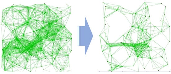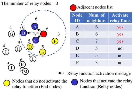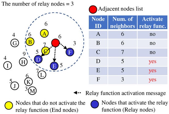 - As shown in Figure 6, each node selects the nodes among its adjacent nodes that have more adjacent nodes and notifies the selected nodes that they should activate the relay function. Each node is set as “the number of relay nodes (N)” in advance. The node i whose satisfies the conditions of Equation (3) is selected as the relay node.