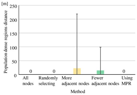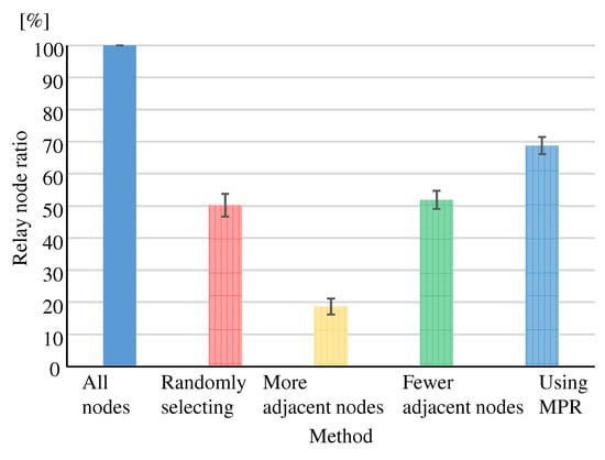 “Using MPR” can reduce the number of relay nodes to nearly 70%, but since the relay node density must be greater than 5 nodes/km2, it was found that the relay node density to which “using MPR” should be applied is 5/0.7 = 7.12 nodes/km2 or greater. This appropriate relay node density value is the result for the node arrangement model based on a regional city (as shown in Figure 9 and Table 1) with a radio propagation range of 1.5 km. The appropriate relay node density will change depending on the evaluation conditions. In particular, it is thought that the value is different in large-scale urban environments, and further simulation experiments are needed.