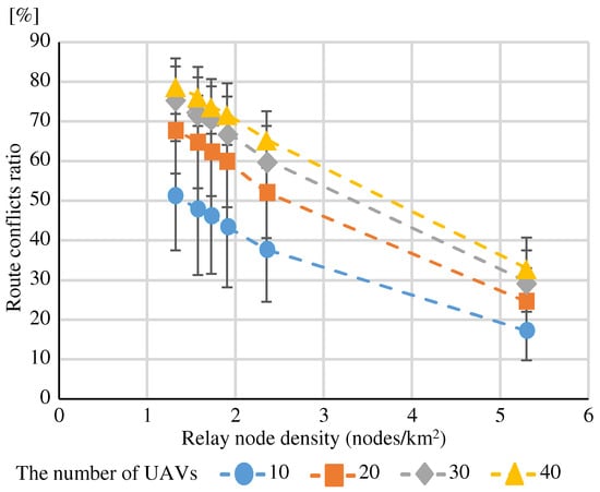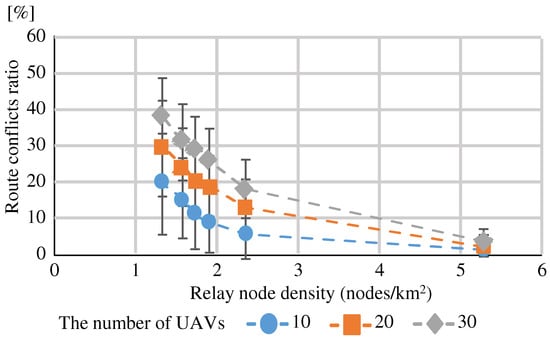 Figure 22 shows the “route conflicts ratios” at each relay node density when the source and destination nodes are located in population-dense regions. The “route conflicts ratio” was lower than that for route constructions between nodes in sparsely populated regions. Although there were routes that bypassed nodes in population-dense regions, many routes were constructed in small population-dense regions. Therefore, the number of relay links was low in almost routes. There were few cases where multiple routes overlapped at relay links. As a result, the “route conflicts ratio” was low. This suggests that “route conflicts ratio” can be suppressed by constructing short-distance routes in addition to increasing the relay node density.