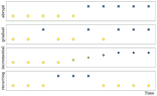 - Gama, J.; Žliobaitė, I.; Bifet, A.; Pechenizkiy, M.; Bouchachia, A. A survey on concept drift adaptation. ACM Comput. Surv. 2014, 46, 1–37. [Google Scholar] [CrossRef]