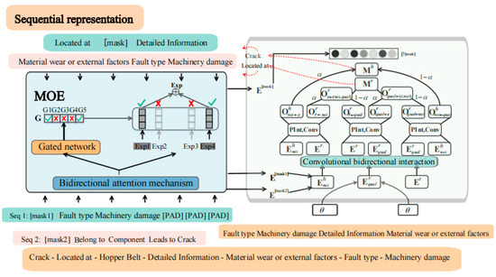 Stage 1: In the first stage, entities are processed through the MOE-LSTM module, where the MOE (Mixture of Experts) features a hierarchical structure that enables the representation learning of input data through multiple experts. The sparsity is achieved by activating only a subset of experts for each sample, which allows the model to efficiently handle complex fault relationships in mining hoist systems. The LSTM (Long Short-Term Memory) component further enhances the model’s ability to capture non-linear patterns and memory characteristics, while learning hierarchical representations. This combination improves the model’s understanding and representation of multi-level features of the data, thus offering flexibility in addressing non-linear fault behaviors typical in mining hoist diagnostics.