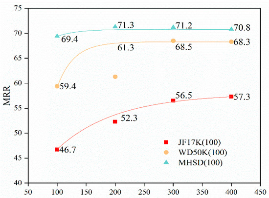 The MRR and are used as ranking metrics. For evaluating a sample , assuming its correct label set is , to calculate the above metrics, it is necessary to count the rank of the correct label of the current evaluation sample among the candidate entities. In counting the rank, the original ranking value directly counts the rank of t among the candidate entities as the final rank. However, considering that the correct label set S includes not only the label t but also other entities, the model only counts the rank of t among the candidate entities, ignoring the correct labels ranked before, leading to a more considerable calculated rank value. Therefore, to filter the rank, all correct labels ranked before t are filtered out before recalculating t as the final rank [38]. Typically, the metrics provided are assumed to be filtered experimental metrics. Based on these statistics, the calculation of MRR is carried out as follows: