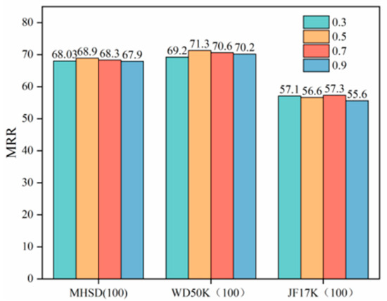 An experiment was conducted to assess the impact of label smoothing on the model’s generalization ability and thus delve deeper into the role of regularization techniques in link prediction to assess the performance impact when label smoothing values were set to 0.3, 0.5, 0.7, and 0.9, respectively. The experimental results are shown in Figure 7.
