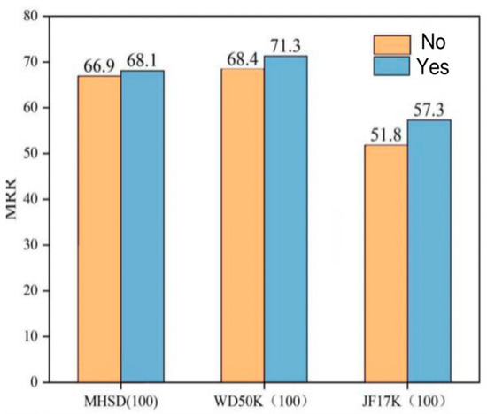 Ablation experiments were conducted to validate each module’s effectiveness in the HyLinker model and the impact of different hyperparameters on performance. The impact of different knowledge representation operations on performance was initially explored, as shown in Table 7. Subsequently, the effects of varying hidden layer sizes, the number of experts, and label smoothing values on performance were studied, with the impact of having vs. not having MOE-LSTM shown in Figure 5, Figure 6, Figure 7 and Figure 8.