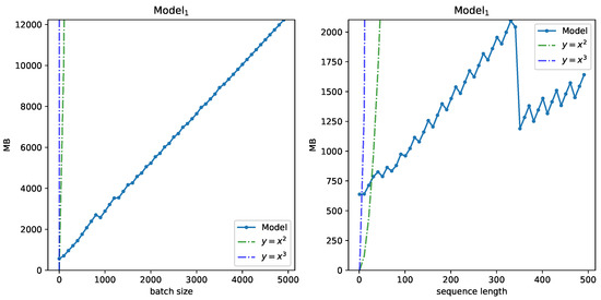 In the same way as studying the time complexity, we also study how the space complexity varies with batch size and sequence length. As shown in Figure 9, for the batch size, we selected 50 data points, starting from 1 and ending at 4901. The sequence length is also 50 points, except that owing to the model’s limitations, the input length is set to a maximum of 491. As shown in the figure, the amount of CUDA memory required is approximately proportional to the batch size and sequence length. Model1 consumes more memory than Model2 for the same data size, which reflects the proportionality of the number of parameters noted in Table 1 above.