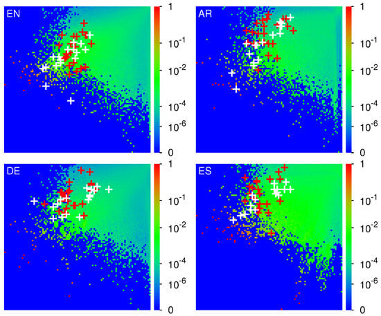 Density of nodes on PageRank–CheiRank plane averaged over logarithmically equidistant grids for () for the four Wikipedia editions EN (top-left), AR (top-right), DE (bottom-left) and ES (bottom-right); the values of node number N for each edition are given in Table 1; the density is averaged over all nodes inside each cell of the grid and the normalization condition is . Color varies from blue at zero value to red at maximal density value; see more details in the text. The x-axis corresponds to and the y-axis to with () being the global PageRank (CheiRank) index for the Wikipedia network of the corresponding edition. The red (white) crosses mark the positions of the 23 society nodes with (17 religion nodes with ) of Table 2 and Table 3.