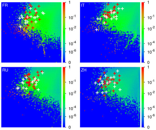 Furthermore, the locations of the 40 edition-specific selected articles of Table 2 and Table 3 are also shown in Figure 1 and Figure 2. We see that, for all editions, religion nodes (white crosses corresponding to ) have typically higher PageRank positions (lower values) as compared to social concepts (red crosses corresponding to ), i.e., typically the top religion nodes appear to be more important than the top society nodes. In particular, for the EN-edition the top religion PageRank index is about 6 times smaller as compared to the top social concept PageRank index, as can be seen from Table 2. For the other editions, we have similar ratios of between the top religion and the top society nodes, which can be seen from the difference of the horizontal positions between the first white cross and the first red cross (difference of ) in the different panels of Figure 1 and Figure 2.