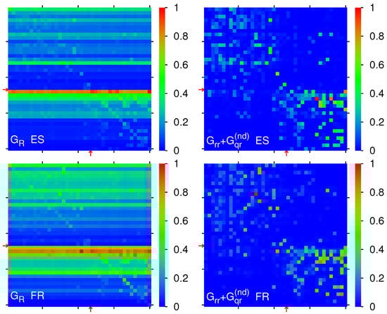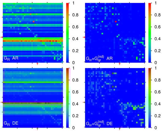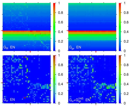 Color density plots of the matrix components for the group of Table 2 and Wikipedia EN edition; the y-axis corresponds to the first (row) index (increasing values of from top to bottom) and the x-axis corresponds to the second (column) index of the matrix (increasing values of from left to right). The outside tics indicate multiples of 10 of . The red arrows indicate the separation between society nodes () and religion nodes () in both axis. The numbers in the color bar correspond to with g being the value of the matrix element and being the maximum value. For , there are some small negative matrix elements corresponding to values ( for other editions shown in other figures below), which are shown with a color very close to blue for zero values.