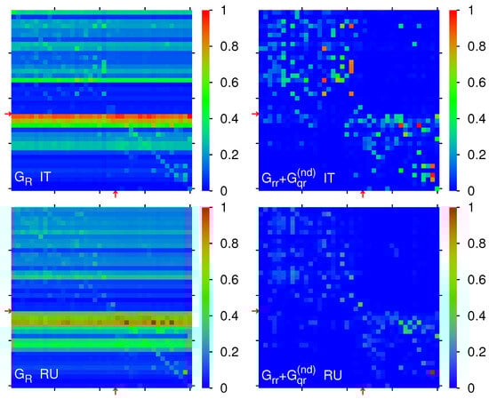 In Figure 3, we show color density plots for , , and for the edition EN with numerical weights being , , and (). The color plot of is essentially composed of rows of equal color with matrix elements for all columns j. Here, the sequence of row colors illustrates the separate PageRange order in the two blocks. The row with red color corresponds to the top PageRank node Catholic Church with , and the first row in the religion block, and the rows below at with orange or (strong) green color correspond to . The color plot of is similar in appearance, due to the strong weight of , but with additional peaks at isolated positions with largest elements of or (including some quite strong diagonal elements of , especially in the religion block).