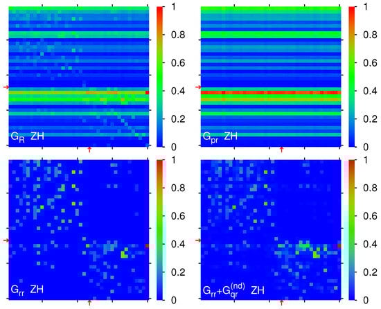 Recall that is, according to (4), given by the sum where represents the direct links, indirect links with being a rank-1 matrix (with columns being rather close to the projected PageRank ) taking into account the contributions of the leading eigenvector in the complementary scattering space (see [22] for details) and is obtained from the other contributions and contains interesting nontrivial information about indirect links. Numerically, is quite dominant in this sum with relative weights – depending on the edition but it has a very simple structure. The interesting properties of the reduced Google matrix are contained in the matrix being the sum of and (with diagonal elements of the latter replaced by 0). For two editions (EN and ZH), we present results for the four matrices , , and while for the other six editions we limit ourselves to and .