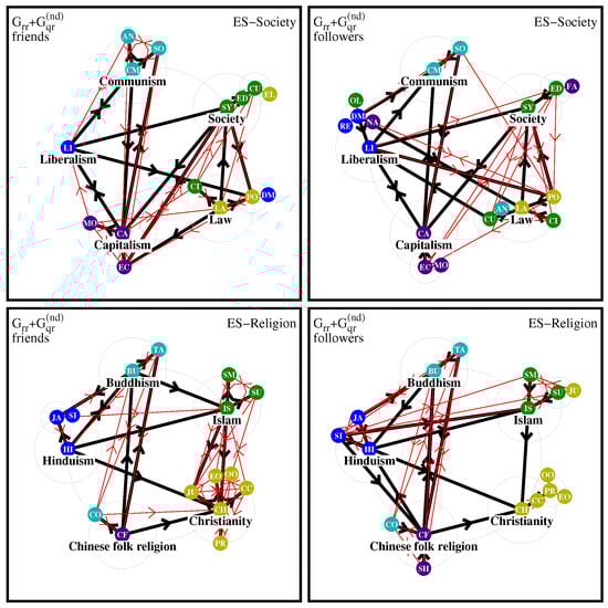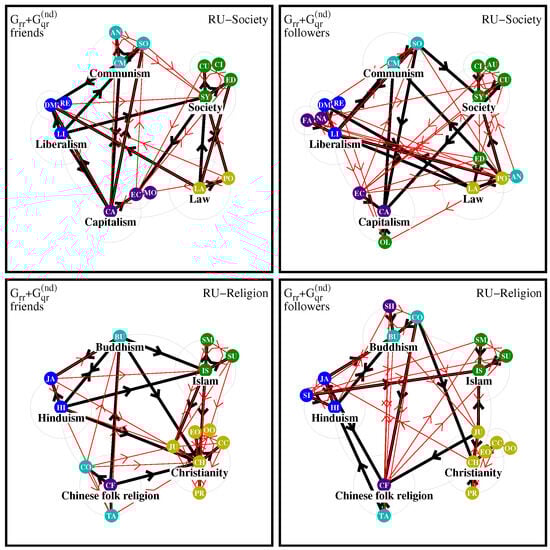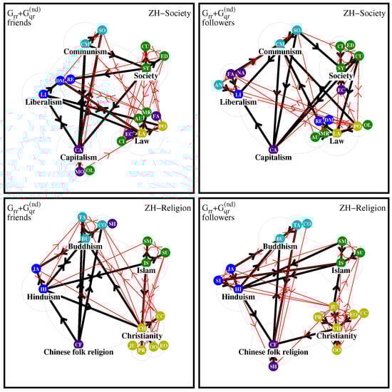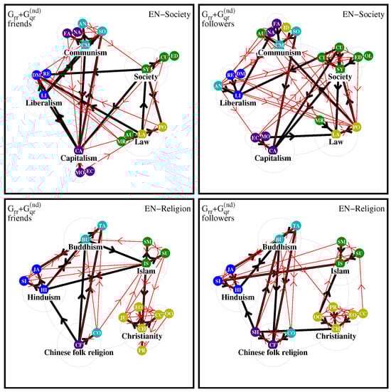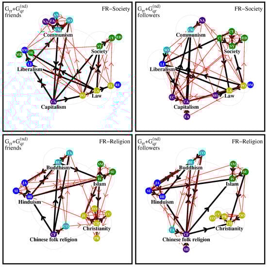 For the FR edition, the network diagrams are shown in Figure 12. Here, the society friend diagram is similar to the case of EN but with fewer links between the Society and Liberalism poles; as for EN, the nodes Nazism and Fascism belong to the Communism natural pole. For the case of followers, the Communism pole has only one node of Nazism (from another initial pole), while for EN this pole contains six members including Fascism and Nazism. The religion diagrams of FR are quite similar with those of EN.