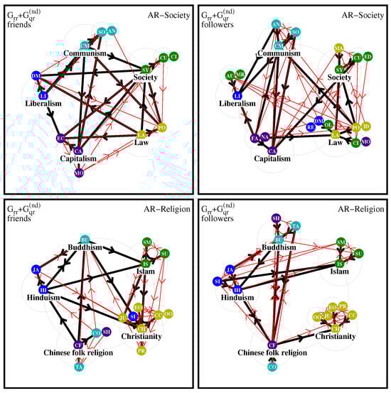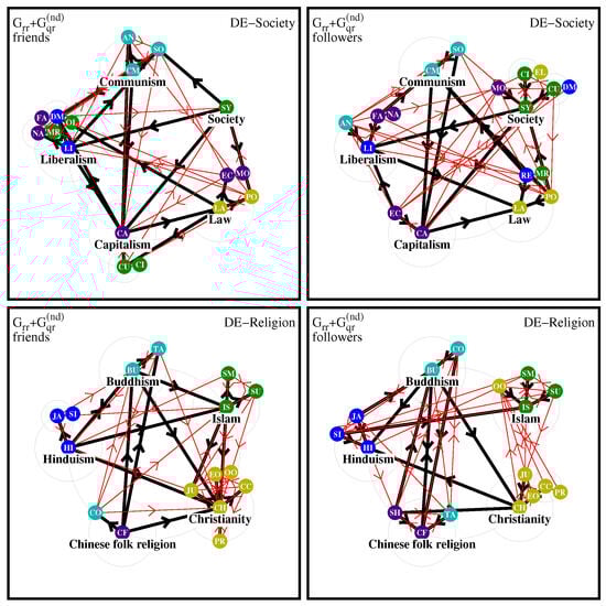 In this work, we present figures for the network diagrams constructed from the two diagonal blocks A for society-related nodes and D for religions of the matrix for the eight different Wikipedia editions. Since there are two friend and follower diagrams for each case, we have four network diagrams per edition presented in a figure with four panels. The subgroups or poles together with their respective five top nodes for both society and religion cases are given in Table 2 (eighth column) and this table also contains a two-letter code for each node (fifth column) used as a node label in the diagrams.
