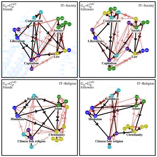 In this section, we present effective network diagrams for friends and followers based on the information contained in the matrix , or more precisely in its two diagonal blocks A for society concepts and D for religions. Since, according to the results of the last Subsection, these two blocks are rather well decoupled with only weak links between them, we will present separate network diagrams for each block. Network diagrams of (nearly) the same style were, for example, used in [22] (for groups of political leaders in the Wikipedia network), [25] (for banks and countries in the Wikipedia network) and [27] (for a specific fibrosis-related protein group in the MetaCore network of proteins).