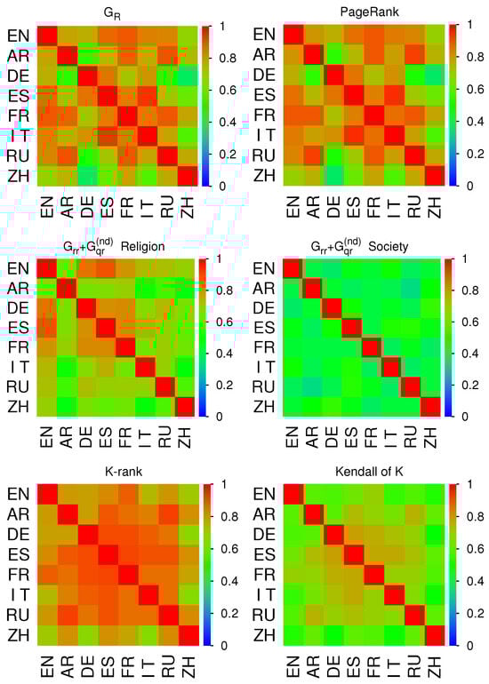 To determine quantitatively the proximity of the eight cultures, we compute the correlators for certain key quantities shown in Figure 16. The six panels of Figure 16 provide -matrix density plots for different inter-edition correlators with five panels for the Pearson correlator of five quantities being the matrix , the (group local) PageRank vector , the religion and society sub-blocks for and the local PageRank index K and one additional panel for the Kendall correlator of K. The precise definitions of these correlator quantities with some additional technical details are given in Section 3.4 and we note that for such correlator quantities the minimal mathematical possible value is , for the case of two data sets with strong anti-correlations, while values close to 0 indicate weak or absent correlations and values close to correspond to strong correlations.